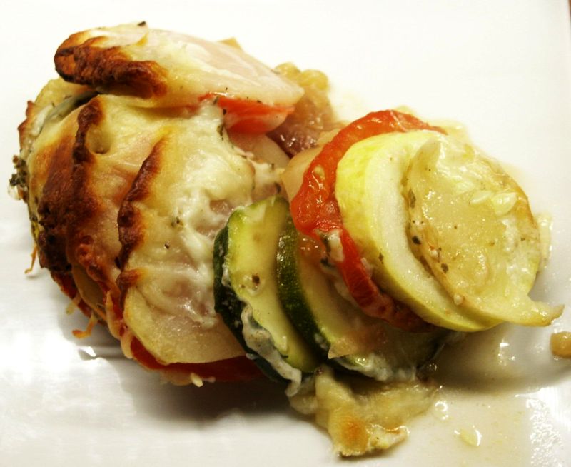 Evenly arrange the vegetable slices vertically in the casserole dish, alternating vegetables. Sprinkle with desired amount of salt, pepper and Italian seasoning.